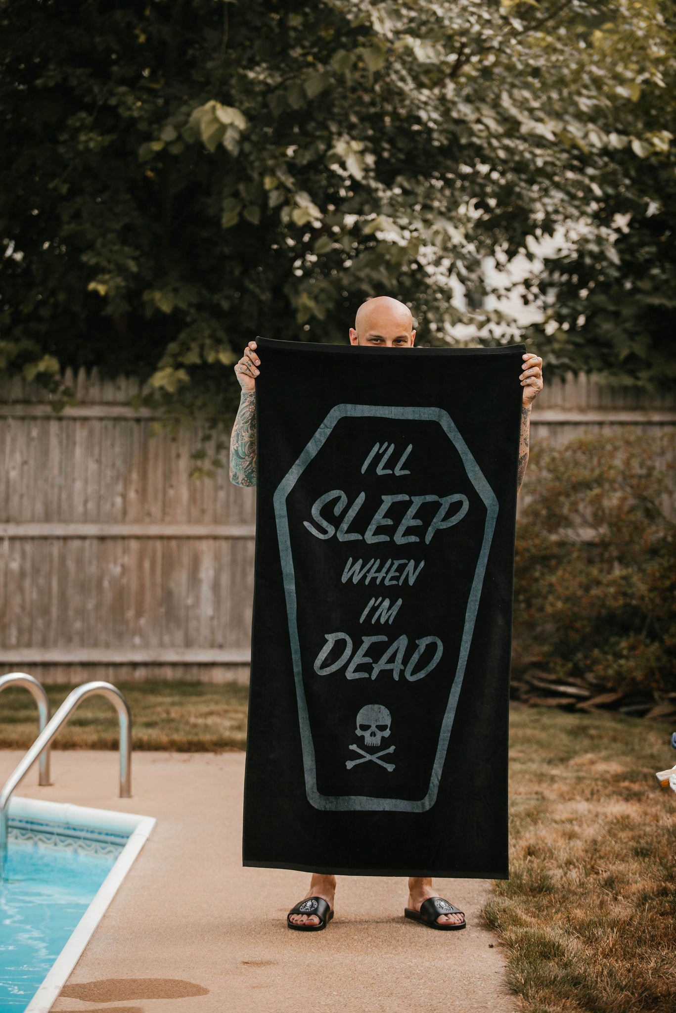 There's no better way to remind people to leave you the hell alone than floating on a coffin-shaped pool float and drying off with a towel that shows you don't mess around. Our pool float and "I'll Sleep When I'm Dead" luxury towel are the best accessories for a pool party by yourself — because let's face it, you really just want to chill in the pool alone for ultimate relaxation.